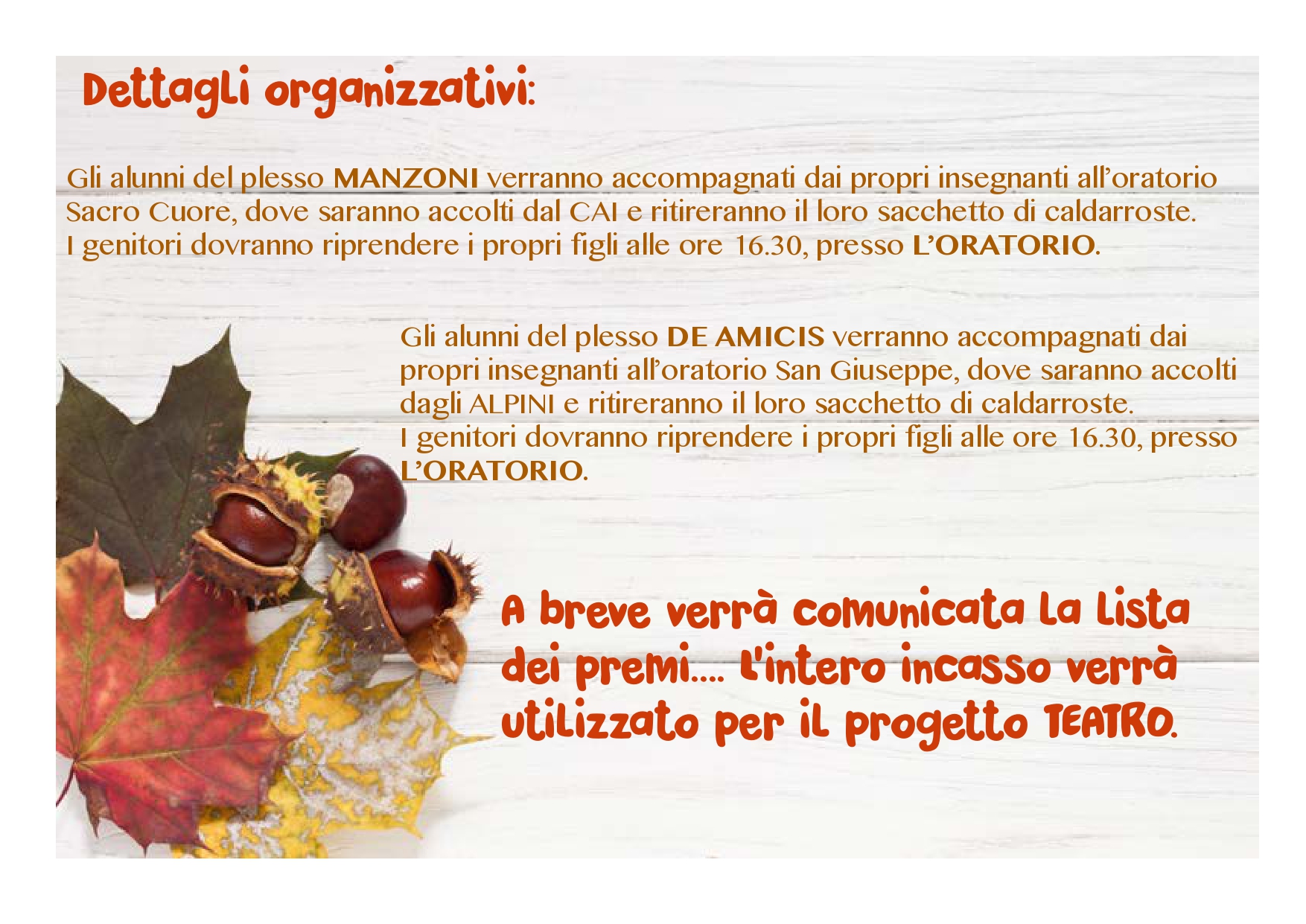 Gli alunni del plesso MANZONI verranno accompagnati dai propri insegnanti all’oratorio Sacro Cuore, dove saranno accolti dal CAI e ritireranno il loro sacchetto di caldarroste. I genitori dovranno riprendere i propri figli alle ore 16.30, presso L’ORATORIO.
