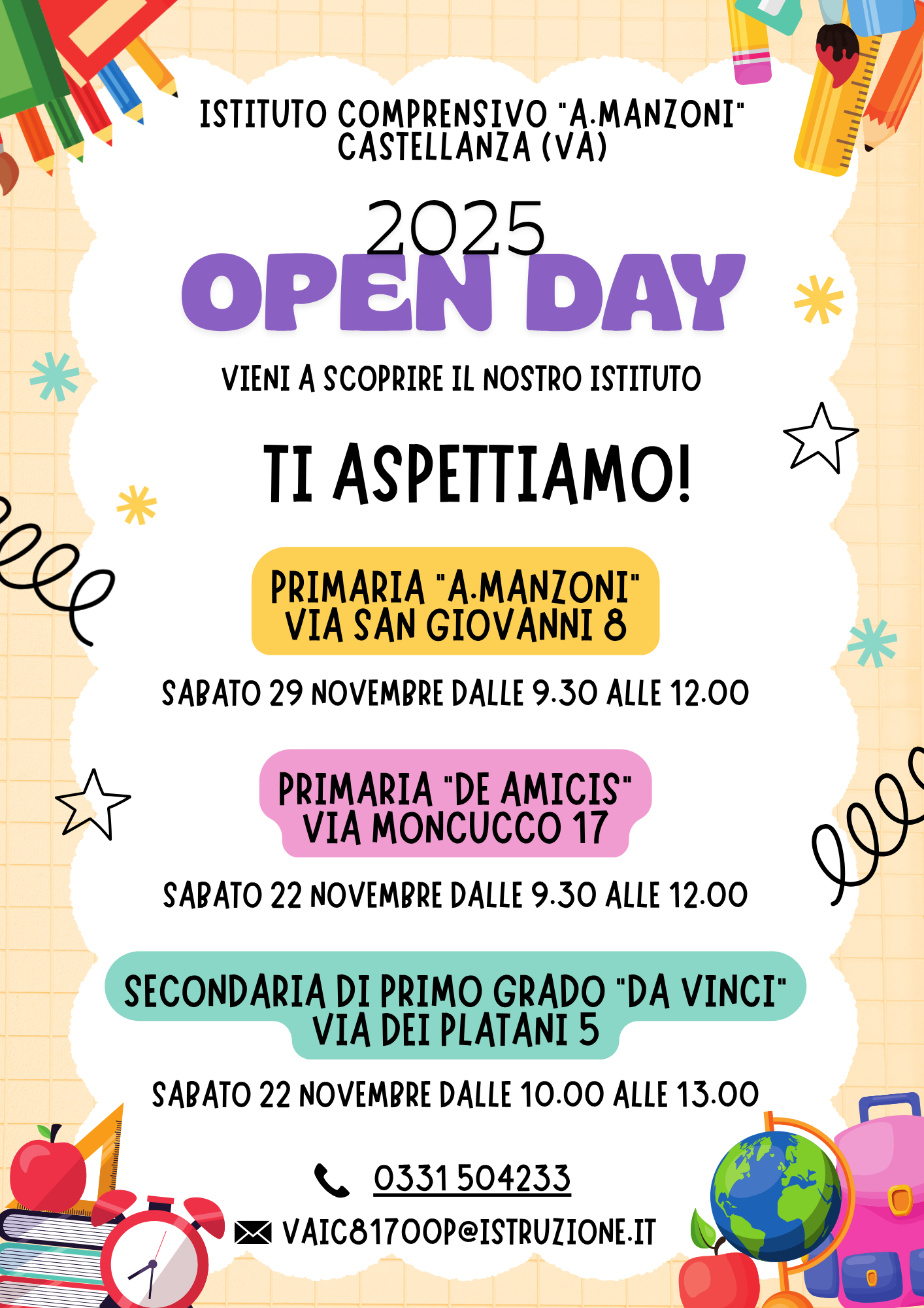 Vi invitiamo con piacere a partecipare all’Open Day del nostro Istituto Comprensivo, un momento speciale pensato per accompagnarvi nella scelta serena e consapevole della scuola in cui iscrivere vostro/a figlio/a.